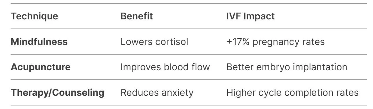 Note: While stress doesn’t cause IVF failure, managing it improves adherence to treatment and overall well-being.