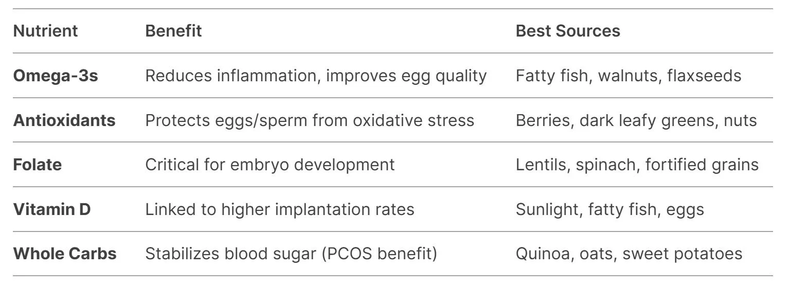 Key Finding: A Mediterranean diet (plant-based fats, lean proteins, whole grains) is associated with 65% higher live birth rates in IVF.