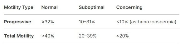 A normal sample has at least 40% motile sperm, with 32% showing progressive movement. Poor motility, known as asthenozoospermia, can reduce the likelihood of sperm reaching the egg—even during IVF—unless ICSI is used.