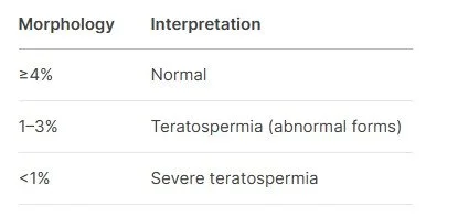 Don’t be alarmed if your morphology seems low—this is one of the strictest fertility measures. Even men with <4% normal forms can still conceive, especially with assistance like ICSI. However, poor morphology may be associated with higher DNA fragmentation, which can affect embryo quality.